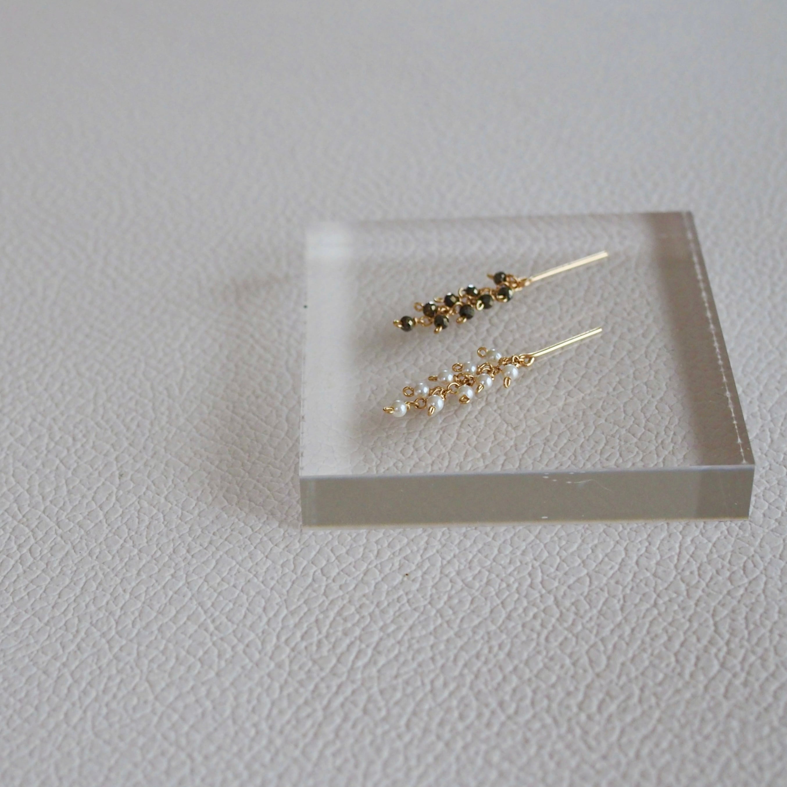イヤリングがなかなかうまく仕上がらずに非常に頭を悩ませましたが、新たに仕入れたネジ式イヤリング金具のおかげでようやっとピアスと同じような枝垂れ感を演出する事に成功いたしました。